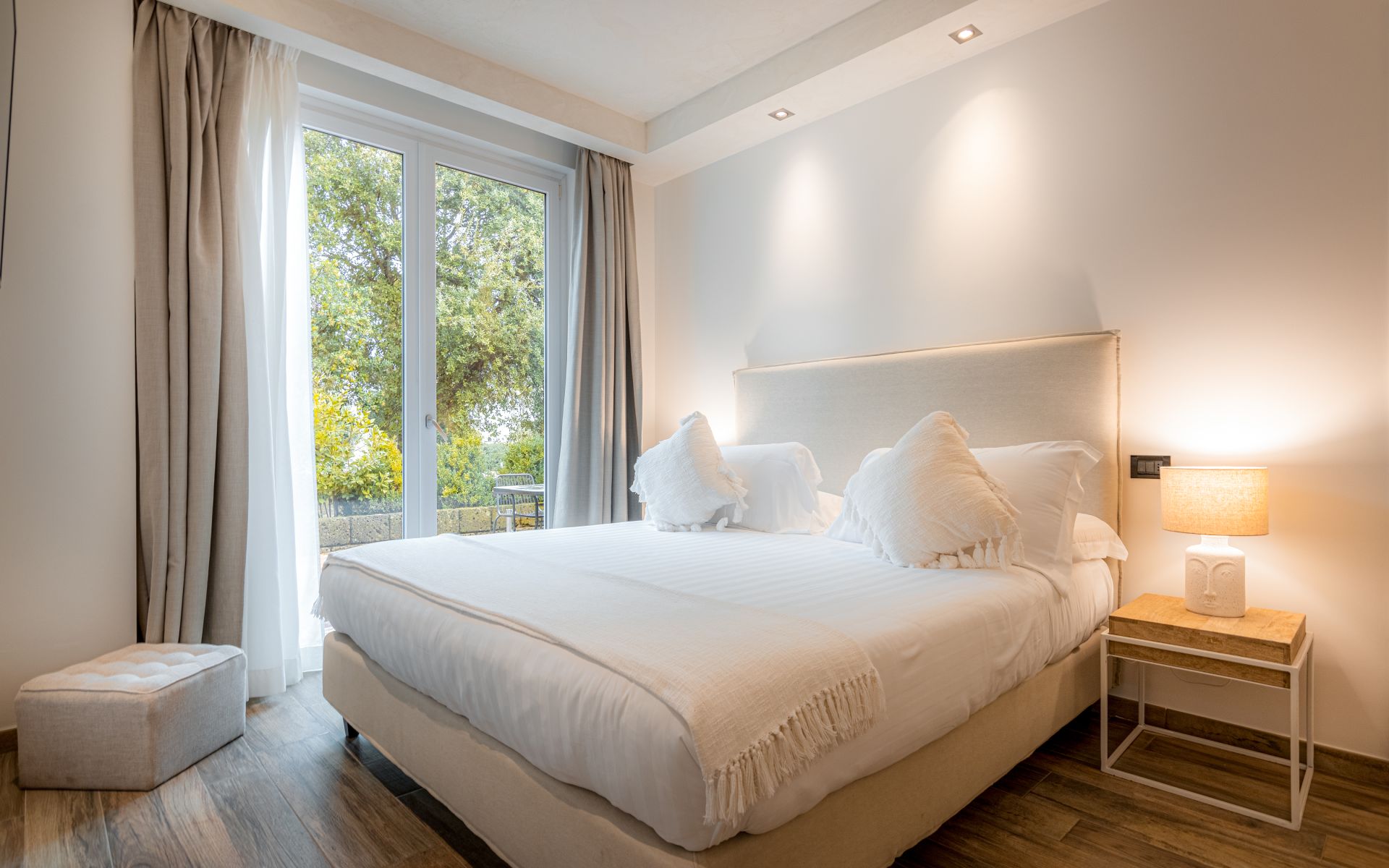 • Una camera matrimoniale con letto king size e vista sul giardino;