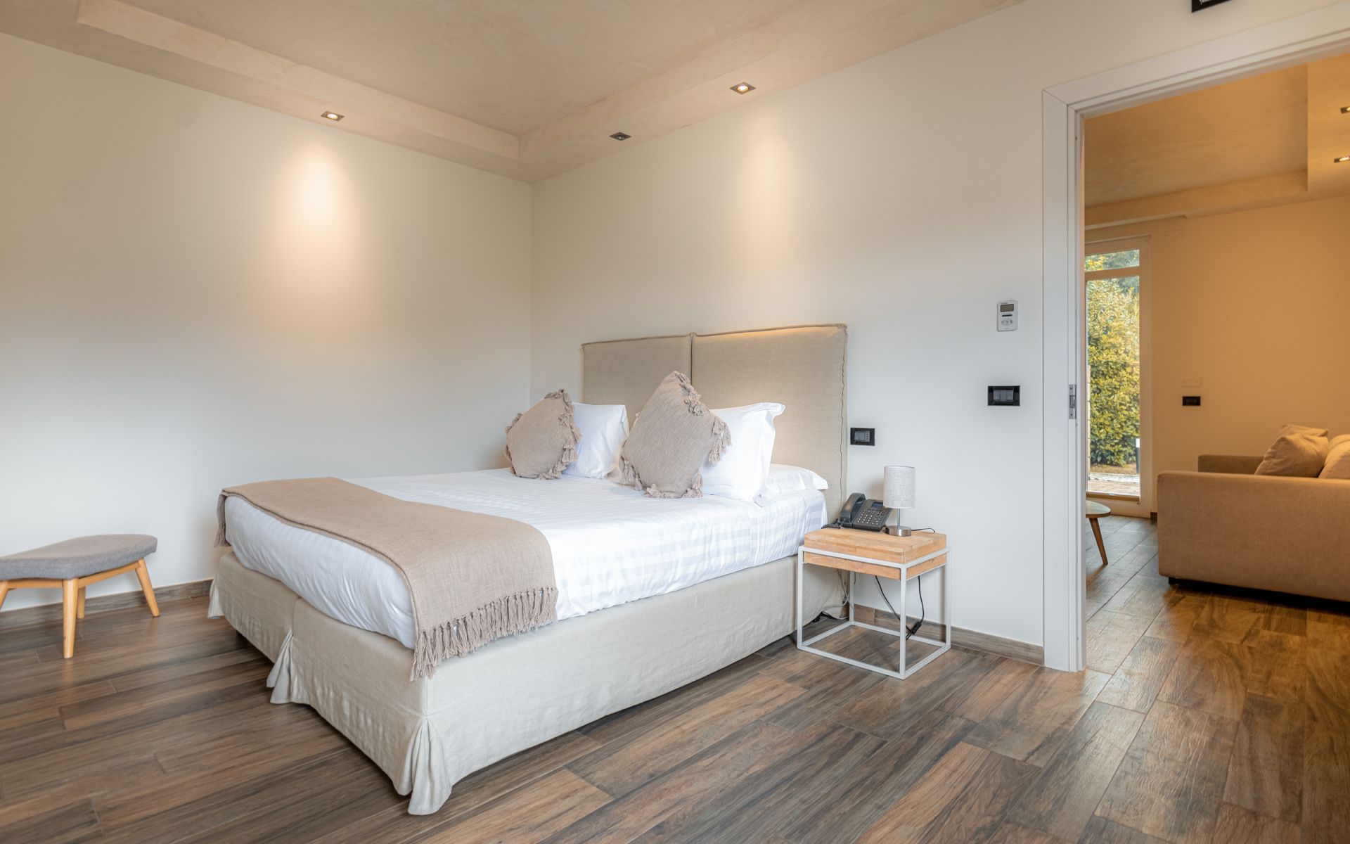 Con una superficie di 35 m², questa camera si distingue per il suo design elegante, l’atmosfera accogliente e il comfort superiore. Si trova al primo piano del resort, con ingresso indipendente e affaccio sul rigoglioso giardino della Tenuta, che regala pace, privacy e contatto autentico con la natura.